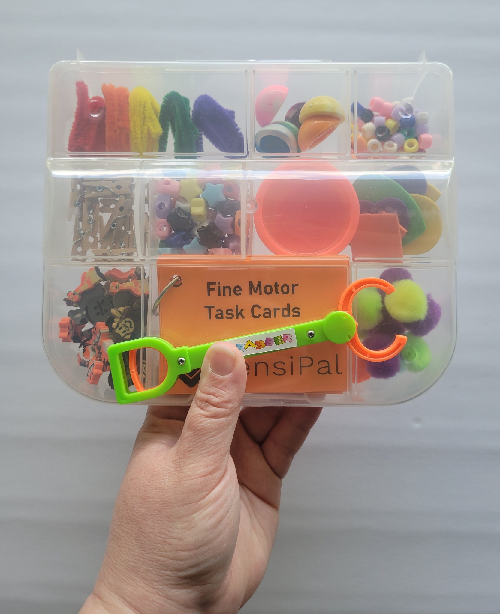 The sectioned organizer is filled with ten different items meant to encourage practicing fine motor skills. Nine Task Cards with tasks to practice a variety of skills are included as well as a finger-powered mini grabber arm.