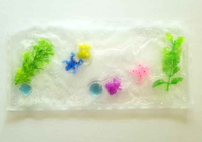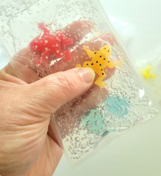 Squishy gel frogs, smooth glass stones, and bumpy seaweed (full size only) are sealed inside a vinyl pouch with clear gel. Smoosh, push, and move them around to settle thoughts and keep fingers busy. The generic theming makes them great for children and adults alike. Use them in the classroom, therapy sessions, on-the-go, or for adults with dementia.